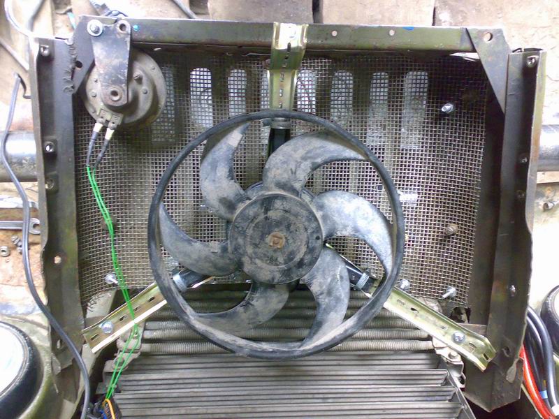 Установлен с помощью ДИН-реек на морду перед радиаторами