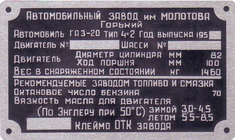 табличка ноерных агрегатов ГАЗ М20 Победа, до 1950 года