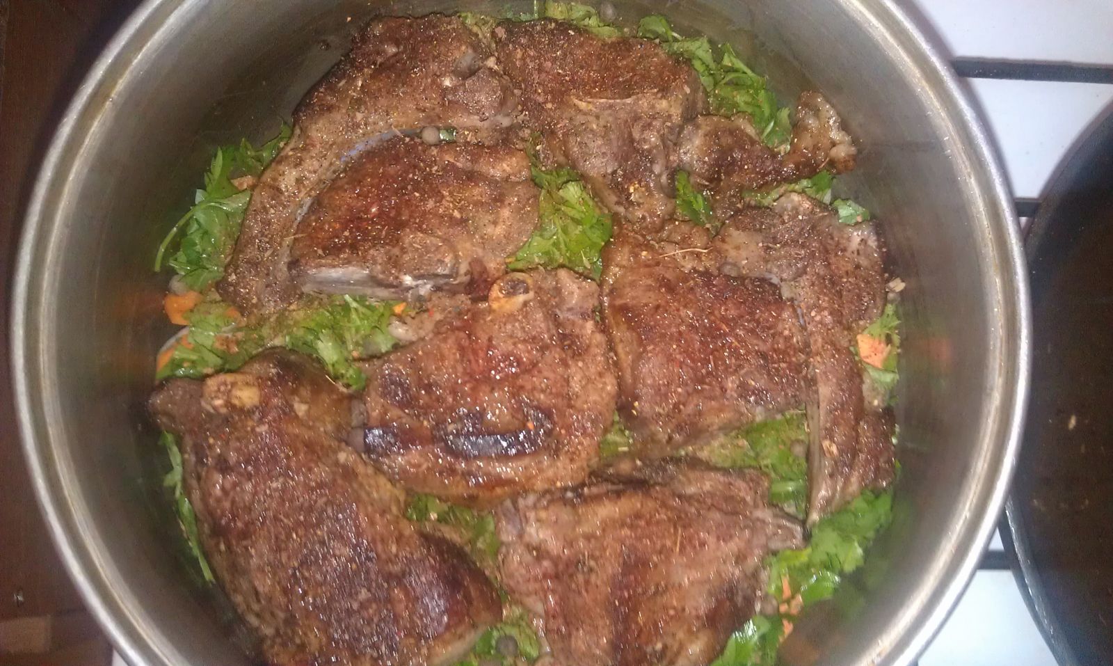 Жаренная баранина выкладывается поверх зелени.