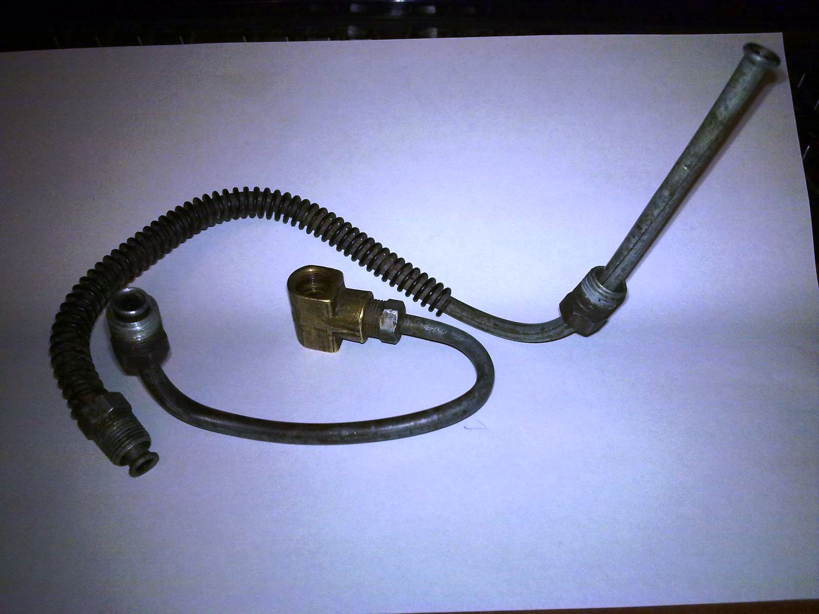 Ориг. тормозные трубки. Стальные, покрыты оловом. Накидные гайки были замазаны пушсалом, резьба окрашена желтой краской, защитная пружина без ржи. В приличном состоянии, пойдут на сборку. Длинная с защитой- трубка от ГТЦ до тройника гл. магистрали. Короткая с тройником - выход на тормозной шланг левого переднего колеса.