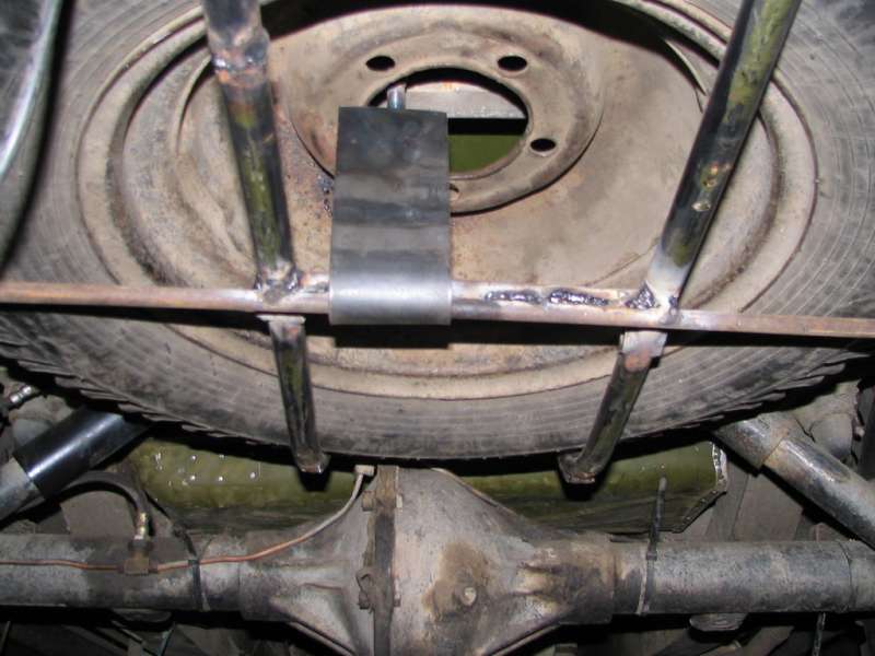 Вот эта пластина прямоугольная загрута буквой Г, сзади к ней приварены две гайки, в которые сверху через пол вкручивается длинный болт. То есть, отпустили болт, пластина полностью не откручивается, скинули пластину с поперечины, опустили на шарнире рамку в которой лежит запаска вниз. Вытащили запаску назад.