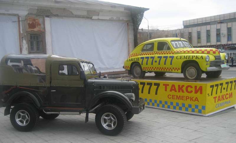 Машины на постаментах в нашем городе. Это реклама.